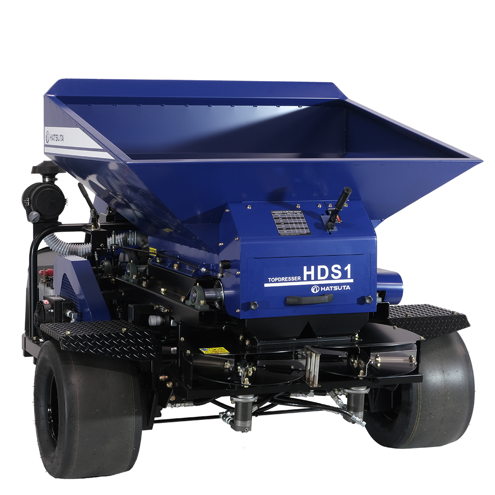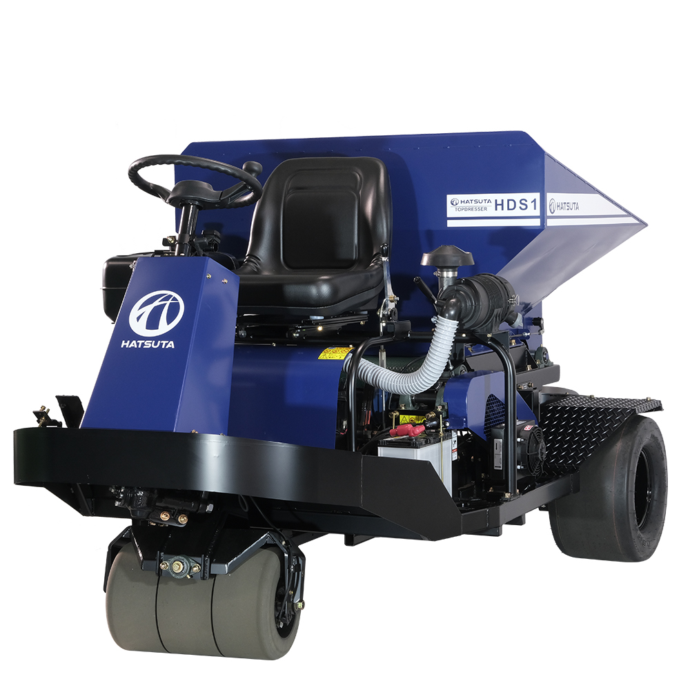 With its tiny body and three wheels, the Hatsuta HDS-1 spinning top dresser is easy to manage on a narrow green. Its dimensions are 2500 mm for body length, 1600 mm for body width, and 2.7 m for turning radius. The back tire has non-patterned rubber tires that are easy to use on the greens, while the front tire is fitted with the traditional Hatsuta polyurethane tire.
